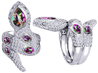 This impressing Original Star K(tm) Good Luck Snake Ring with Rainbow Mystic Topaz Stones, crafted in 925 Sterling Silver. This amazing design is mounted with 1 stone bezel set multicolor Pear Shape Mystic Topaz clean clarity, 2 stones bezel set multicolor Oval Mystic Topaz clean clarity, 2 stones bezel set multicolor Oval Mystic Topaz clean clarity, 150 stones prong set colorless Round Brilliant Cubic Zirconia. This style measures 22.00 mm wide, 38.00 mm long. Designer: Star K - This beautiful design, is part of the exclusive Star K. jewelry collection. Star K. designs are copyrighted, so please be aware of cheap imitations selling online. Only original Star K. creations are made using the highest quality materials and craftsmanship, backed by an exclusive Lifetime Warranty. Warranty: - This item is covered by Finejewelers exclusive Silver Shield Lifetime Warranty. This exclusive lifetime coverage is offered ONLY by Finejewelers so please shop with confidence, our quality is guaranteed for life!