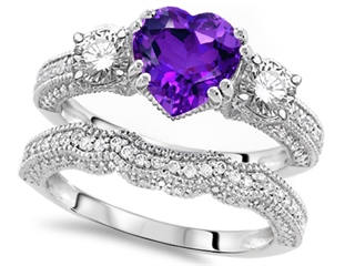 This amazing Original Star K(tm) Heart Shape 7mm Genuine Amethyst Engagement Wedding Set, crafted in 925 Sterling Silver. This attractive design is set with 1 stone prong set violet Heart Shape Amethyst eye clean clarity, 2 stones prong set colorless Round Brilliant Cubic Zirconia, 58 stones prong set colorless Round Brilliant Cubic Zirconia. This design measures 15.00 mm wide, 7.00 mm long. Amethyst is February Birthstone: From the Greek 'amethystos' meaning 'sober'. A symbol of trust, Amethyst is thought to protect against seduction and provide peace. Designer: Star K - This beautiful design, is part of the exclusive Star K. jewelry collection. Star K. designs are copyrighted, so please be aware of cheap imitations selling online. Only original Star K. creations are made using the highest quality materials and craftsmanship, backed by an exclusive Lifetime Warranty. Warranty: - This item is covered by Finejewelers exclusive Silver Shield Lifetime Warranty. This exclusive lifetime coverage is offered ONLY by Finejewelers so please shop with confidence, our quality is guaranteed for life!