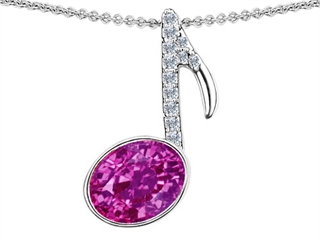 This impressive Original Star K(tm) Musical Note Pendant With Created Pink Sapphire Oval 11x9mm, crafted in 925 Sterling Silver. This attractive design is mounted with 1 stone bezel set pink Oval Created Pink Sapphire eye clean clarity, 10 stones prong set colorless Round Brilliant Cubic Zirconia clean clarity. This design measures 15.00 mm wide, 26.00 mm long. Sapphire is September Birthstone: From the Latin 'sapphirus' meaning 'blue'. A symbol for truth and sincerity, it inspires spiritual enlightenment, health and inner peace. Designer: Star K - This beautiful design, is part of the exclusive Star K. jewelry collection. Star K. designs are copyrighted, so please be aware of cheap imitations selling online. Only original Star K. creations are made using the highest quality materials and craftsmanship, backed by an exclusive Lifetime Warranty. Warranty: - This item is covered by Finejewelers exclusive Silver Shield Lifetime Warranty. This exclusive lifetime coverage is offered ONLY by Finejewelers so please shop with confidence, our quality is guaranteed for life!
