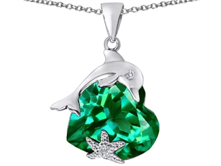 This stunning Original Star K(tm) Lucky Dolphin and StarFish Pendant with Heart Shape Simulated Emerald, crafted in 925 Sterling Silver. This beautiful design is set with 1 stone prong set green Heart Shape Simulated Emerald clean clarity, 2 stones bezel set colorless Round Brilliant Cubic Zirconia. This product measures 18.00 mm wide, 28.00 mm long. Emerald is May Birthstone: From the French 'esmeralde' meaning 'green gem'. A symbol of immortality, it is said to improve memory, wisdom and intuition. Free 18 inches Sterling Silver Chain included Designer: Star K - This beautiful design, is part of the exclusive Star K. jewelry collection. Star K. designs are copyrighted, so please be aware of cheap imitations selling online. Only original Star K. creations are made using the highest quality materials and craftsmanship, backed by an exclusive Lifetime Warranty. Warranty: - This item is covered by Finejewelers exclusive Silver Shield Lifetime Warranty. This exclusive lifetime coverage is offered ONLY by Finejewelers so please shop with confidence, our quality is guaranteed for life!